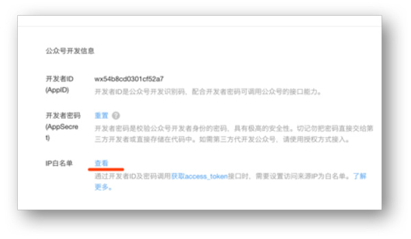 步骤4 微信公众号基本配置页面,需要添加访问域名所在的IP地址到白名单