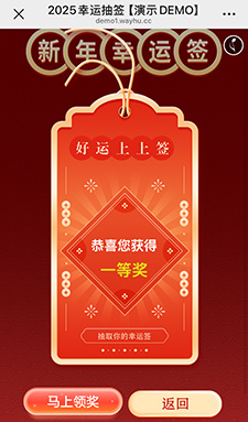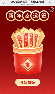 新年幸运签抽奖,节气抽奖热门活动。奖品为实物或者红包,可设置一定的概率。活动推出,吸引大量客户过来参与其中。