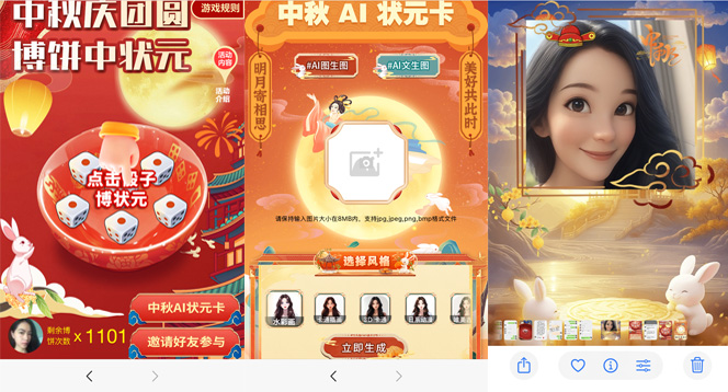 微信中秋博饼千年文化名俗可有更多“新玩法”,传统IP与AI结合、互动趣味化、互动奖励等以游戏化传播中秋的节日氛围,让年轻人重新认识和热爱传统文化。微信中秋博饼、中秋答题博饼、中秋吃月饼等互动活动,通过线上互动游戏玩法,虚实交融的参与模式,最方便的社交裂变机制实现朋友圈广泛传播。